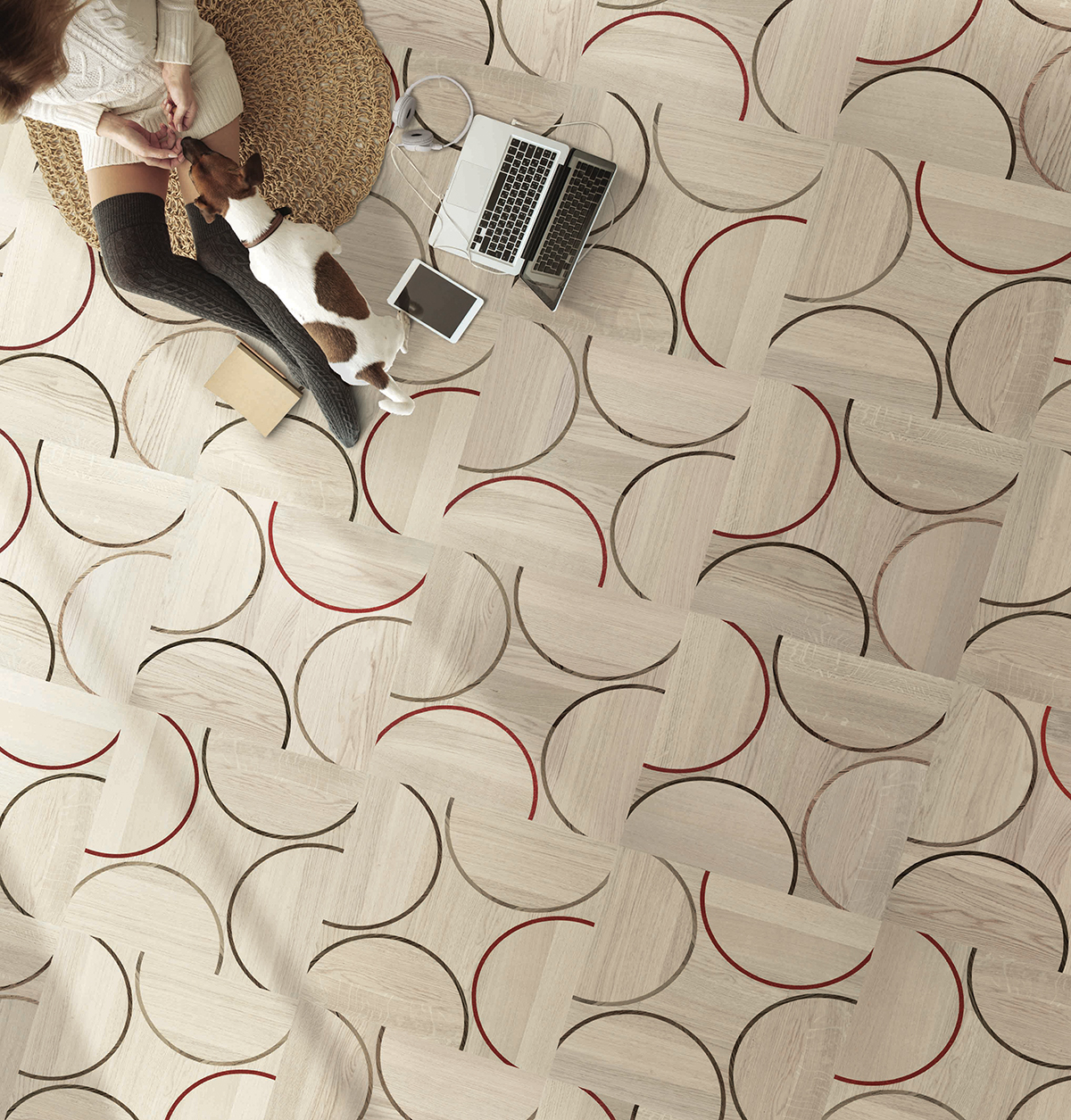 Inspiré des forêts du Nord, le parquet en dalles Stockholm marie harmonieusement la linéarité et l’essentiel avec la rigueur des formes géométriques et des modules de couleurs. Un design simple, épuré et esthétiquement équilibré, évoquant la nature des paysages suédois. Le parquet en dalles Stockholm se compose d’un fond en chêne clair, légèrement brossé pour mieux souligner la texture du bois. Des formes arrondies en teck et des inserts en résine rouge viennent s’alterner élégamment au chêne.